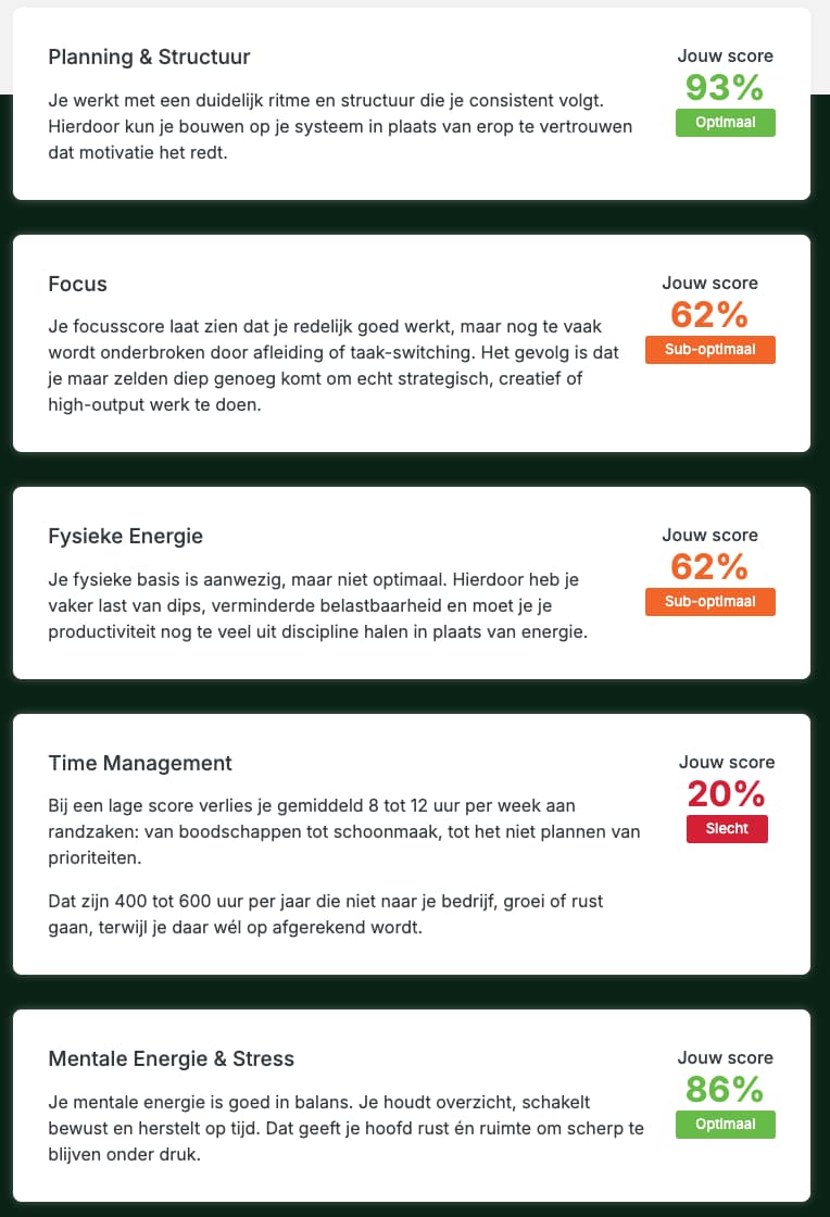 Daarnaast krijg je op je mail een gepersonaliseerd rapport met gerichte actiepunten om je grootste bottleneck direct op te lossen.